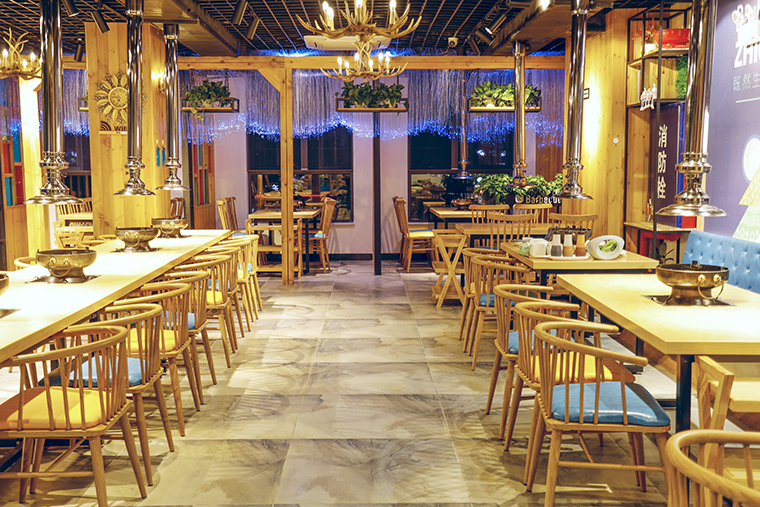 4、餐廳照明:一家有出色的燈光設計的餐廳可以給顧客帶來視覺與味覺的雙重享受,讓人身心愉悅。好的燈光設計,可以增加食物質感,還原食材的真實顏色從而激發顧客的食欲。炙成一派采用了3500K色溫照明,在燈光照耀下,展現牛羊肉的新鮮肉質感,同時偏暖的光源也營造出溫馨、舒適的就餐環境。在燈具的選擇上,我們使用了與空間裝飾風格想匹配的工業風蠟燭吊燈,而在靠窗一側,則使用了垂釣而下的絲帶燈,顧客在用餐之余仿佛將自己置于星星閃爍的蒼穹星空之下,非常有情趣。