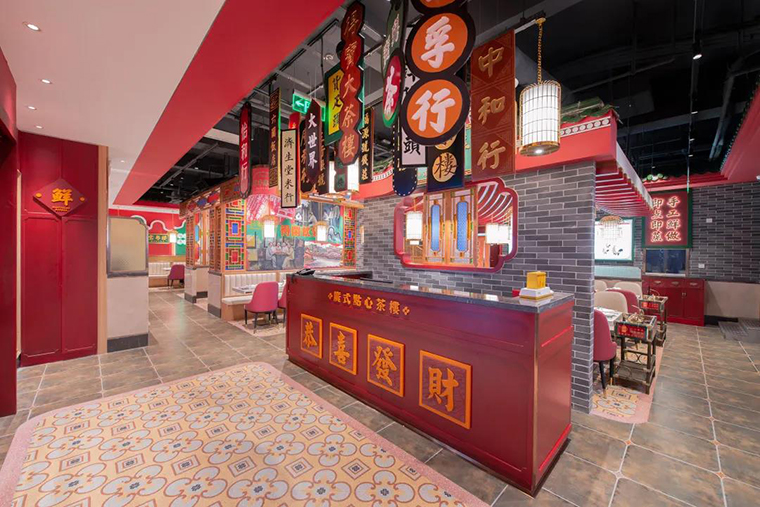 品深餐飲全案策劃設(shè)計的悅得閑廣式點心茶樓則從品牌本身出發(fā),從“得閑飲茶”這一核心文化母體提取“閑”文化,整個空間裝飾以“一杯在手,半日清談”為主題,并大紅配大綠,富貴吉祥又添財氣為主色,很好的表現(xiàn)了廣式飲茶及點心文化,并與同品類形成了明顯的區(qū)分,形成了悅得閑自己獨有的風(fēng)格。
