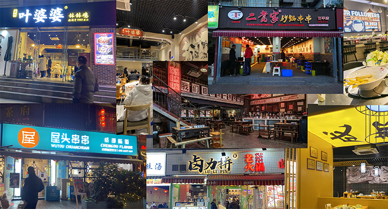 在成都,品深團隊先后實地走訪了鋼管廠五區小郡肝、花嘴巴、馬路邊邊、洪七公、九街淑芬、二當家等知名的串串火鍋。為了更好的感受串串火鍋現場消費特點,我們特意選擇周日餐飲旺時,周一餐飲閑時在門店蹲守觀察。