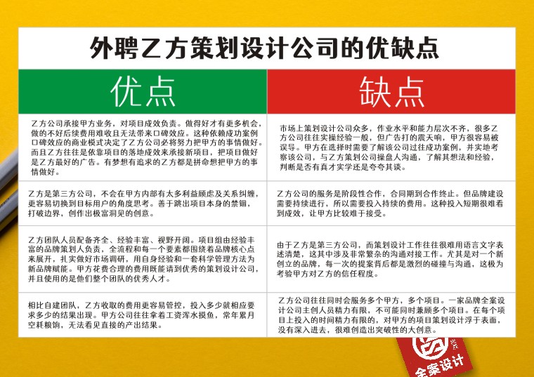 缺點3:由于乙方是第三方公司,而策劃設計工作往往很難用語言文字表述清楚,這其中涉及非常繁雜的溝通對接工作。尤其是對一個新創立的品牌,每一次的提案背后都是激烈的碰撞與溝通,這極為考驗甲方對乙方的信任程度。