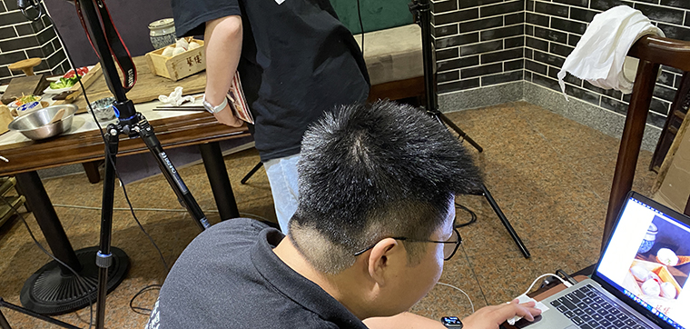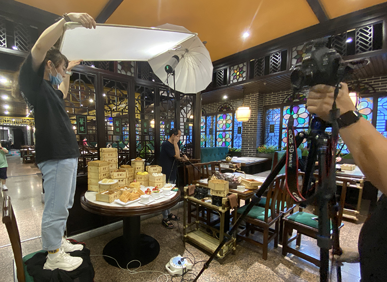 為達到理想拍攝效果,品深設計師再次來到蘩樓與廚師交流,了解這十款產(chǎn)品的特色,用料,制作工藝等細節(jié),同時也購買有關廣式點心制作相關書籍進行對比學習,獲得很多新發(fā)現(xiàn),如:判斷手工炸油條好壞,必須要展示其“絲瓜囊狀”橫切面。而蘩樓的油條比其他茶樓的都大,比一個正常成年人手臂還粗,賣點更多。