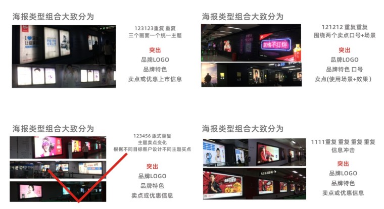 我們選取了(周末時間+上班時間)兩天,對深圳客流密集的多個地鐵中轉站點,和幾個特定時間段。進行現(xiàn)場蹲點觀察,并拍攝了目前1000多張地鐵站現(xiàn)存的海報圖片實例。通過對海報圖片的分類整理,地鐵站客流對廣告關注度點的觀察。最終團隊投票選取出印象最深且能傳達品牌信息的多張地鐵站品牌海報進行廣告?zhèn)鞑ピ砑霸O計原理逆向推理分析: