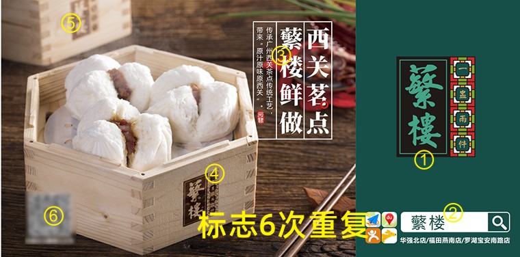a 畫面重復三次以上出現(xiàn)“蘩樓”logo信息:由于顧客是路過,而且離畫面很近,所以眼光掃射之處并不是全部看見海報的,而是海報的某一個角落或一個點一個面的形式組合。因此畫面中我們從廣告語“西關茗點,蘩樓鮮做”+蘩樓logo+搜索框“蘩樓”+蒸籠上“蘩樓”,在一個畫面中多次刻意出現(xiàn)蘩樓品牌logo。