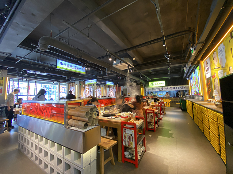 品深餐飲全案團隊專程去成都體驗了很多家串串香火鍋店,發現不少串串香火鍋藏在街頭巷尾,空間環境狹小閉窄,收納功能做得很差,各種物料都是亂放亂堆,美其名曰是煙火氣,現場感受是臟亂差,用餐非常難受。所以我們在設計規劃鹵串哥的門店時,座位分布上,8人卡座與4人散臺相結合,座椅的尺度比例比常規串串香寬闊了很多,流轉效率更高,翻臺率也更高了。