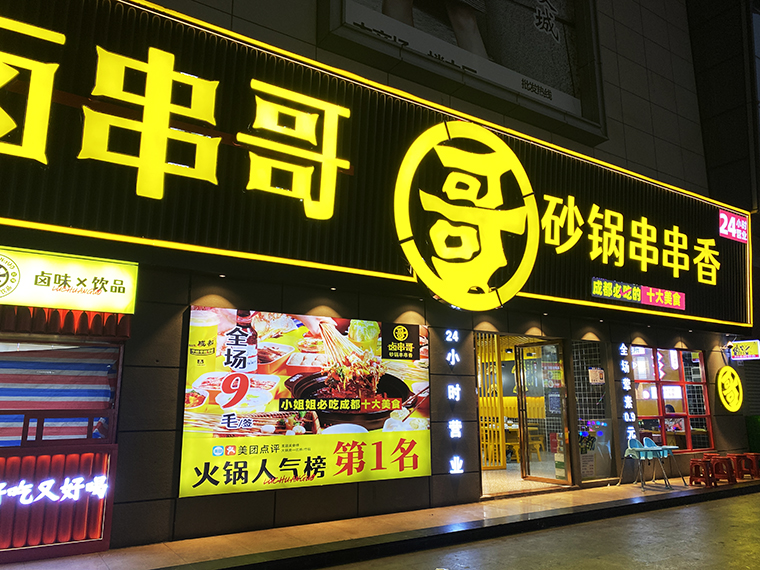 餐廳門面設計除了要大之外,還要傳達顧客最關注的有效信息。這也是品深稱之為進店理由以及消除顧客的進店顧慮等。比如賣的什么產品,有什么特色,價格如何,營業時間等。鹵串哥的幾個店門面設計中,我們一直堅持將鹵串哥地道成都砂鍋串串香,小姐姐必吃成都十大美食,24小時營業,9毛一簽,一串一簽這幾個核心內容不斷重復展現,目的就是把有效信息持續傳播,顧客快速接收,迅速決策。