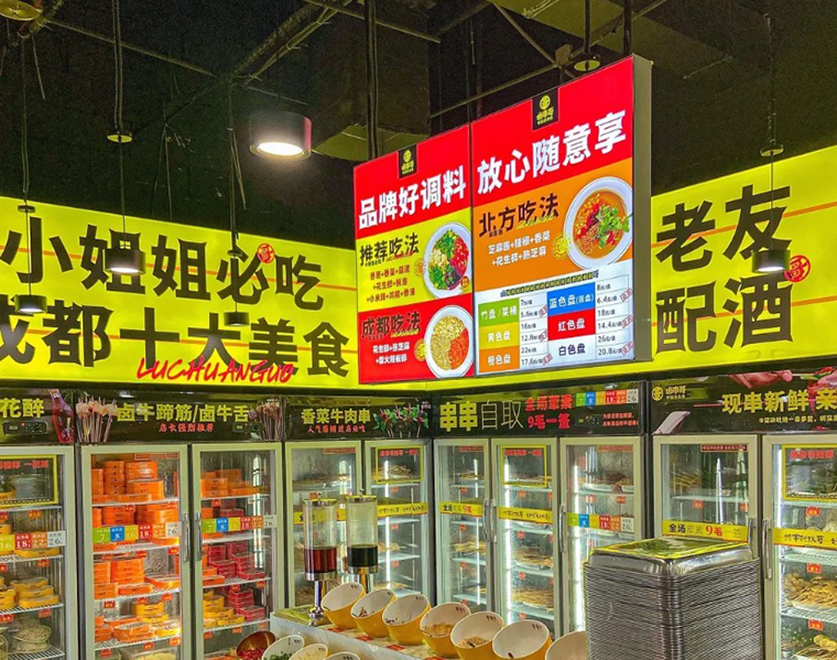 4、空間門店中最醒目的就是取串串的一長溜冷鮮柜,甲方團隊希望多用廣告畫面展示菜品賣點,各種酒水飲料等。我們則認為放菜品畫面太小,傳播力很弱,圖片也分散,關注度更低。我們直接用一句話語來傳達:小姐姐必吃成都十大美食。既討巧了我們的主流客群,也用成都這一大IP來背書。很特別,很震撼,效果當然更好。其他需要傳達的信息如產品價格、產品核心賣點,我們都用背膠貼的形式,貼在冷鮮柜門上,廣告效應顯著。